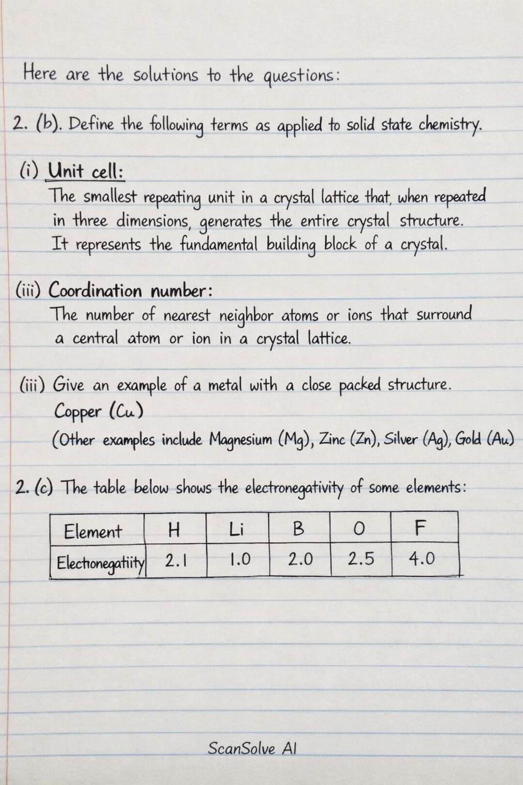 (i) Coordination number: The number of nearest neighbor atoms or ions that surround a central atom or ion in a crystal lattice.