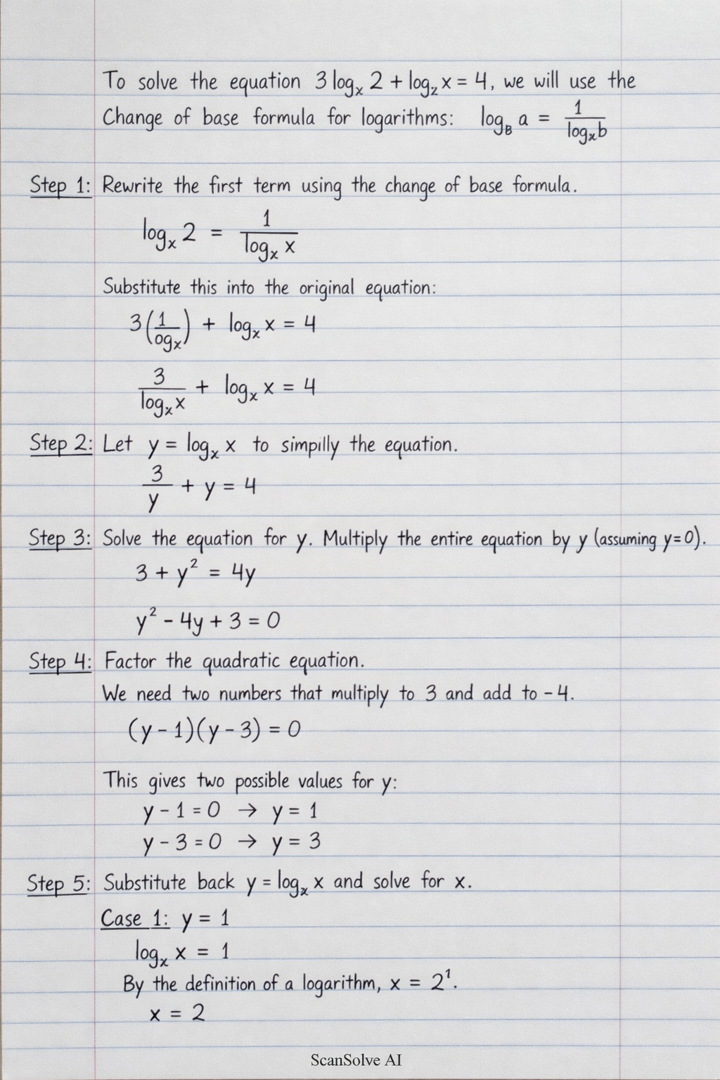 Step 1: Rewrite the first term using the change of base formula. Substitute this into the original equation: