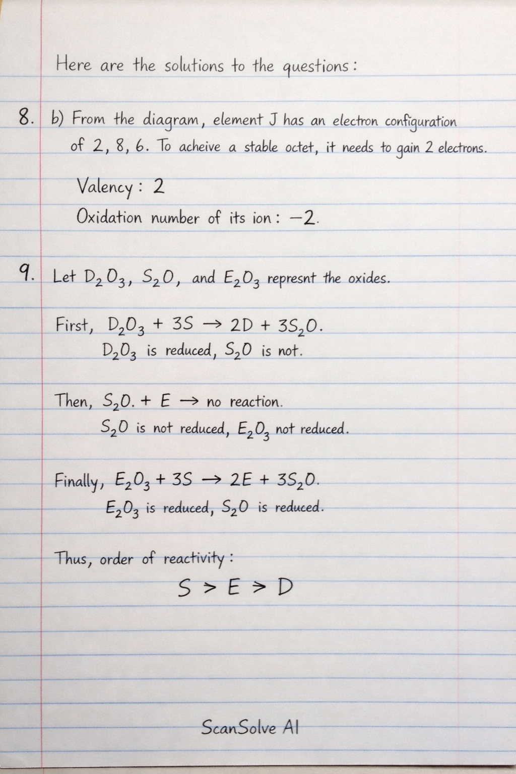 9. When the oxide of metal D is heated in the presence of metal S, the oxide is reduced. The oxide of metal S is not reduced when heated together with metal E and with metal D. The oxide of metal E is reduced by metal S and not by metal D. Arrange the three metals horizontally, in their order of decreasing reactivity.