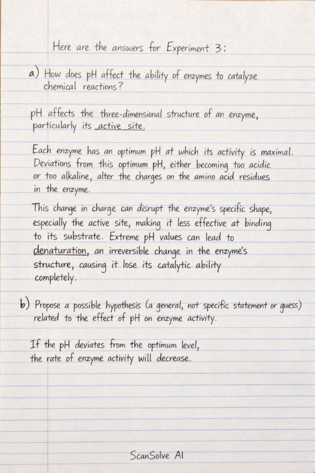 b) Propose a possible hypothesis (a general, not specific statements or guess) related to the effect on pH on enzyme activity.