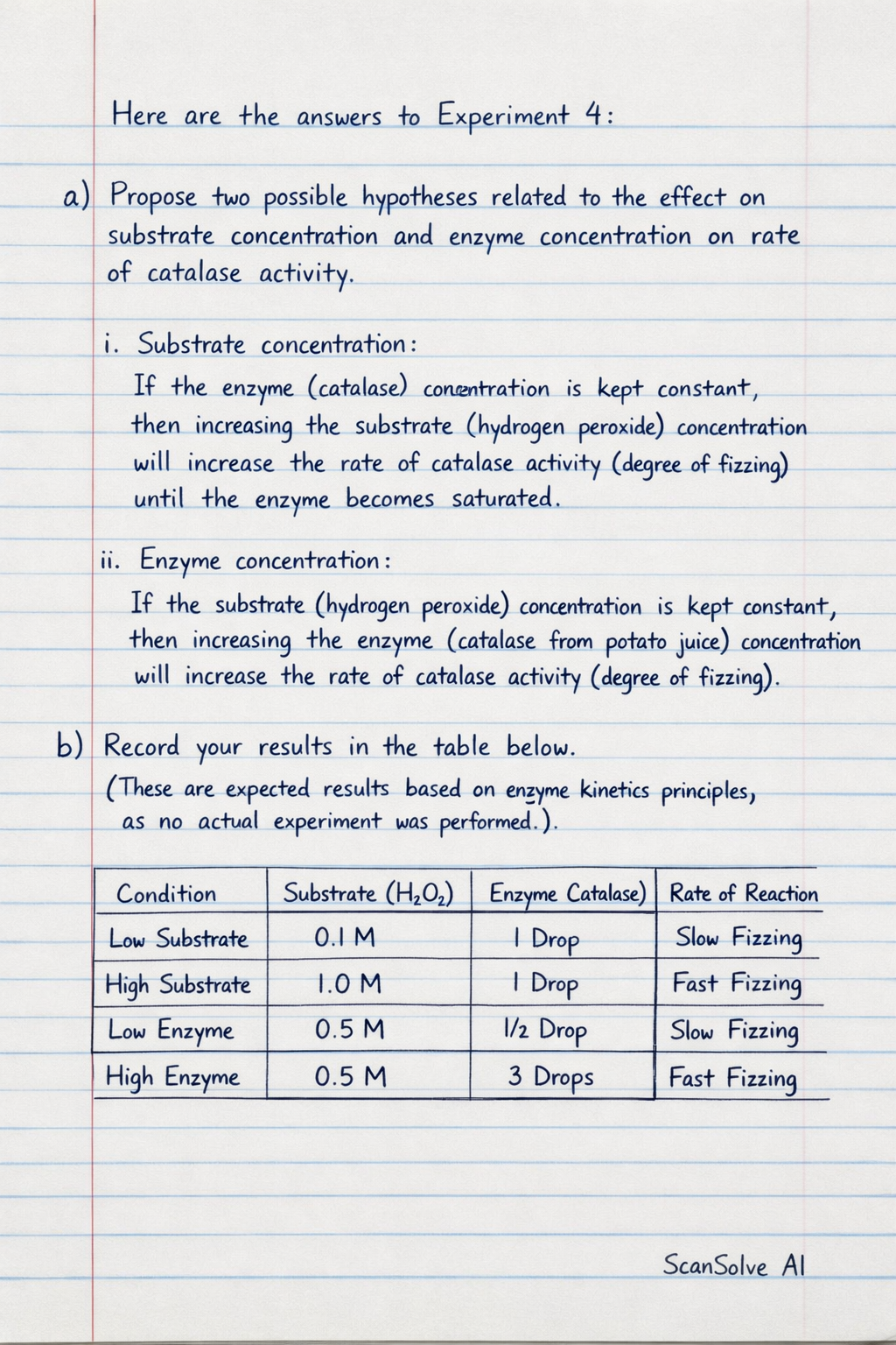a) Propose two possible hypotheses (a general, not specific statements or guess) related to the effect on substrate concentration and enzyme concentration on rate of catalase activity
