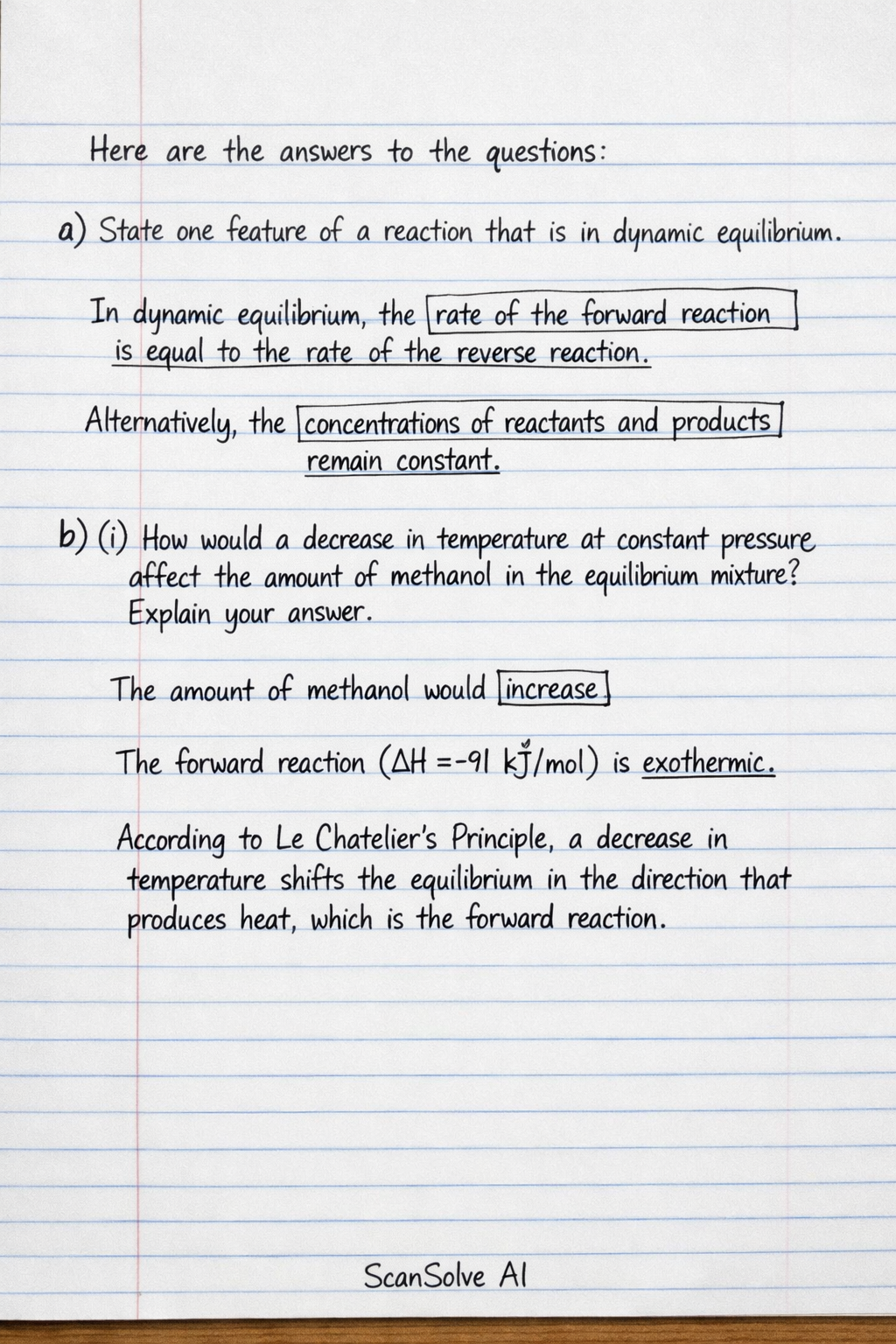 b) (i) How would a decrease in temperature at constant pressure affect the amount of methanol in the equilibrium mixture? Explain your answer.