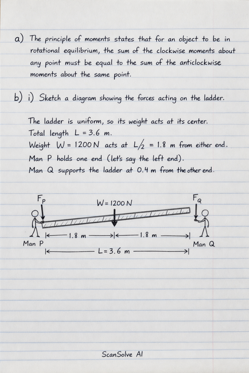 a) The principle of moments states that for an object to be in rotational equilibrium, the sum of the clockwise moments about any point must be equal to the sum of the anticlockwise moments about the same point.