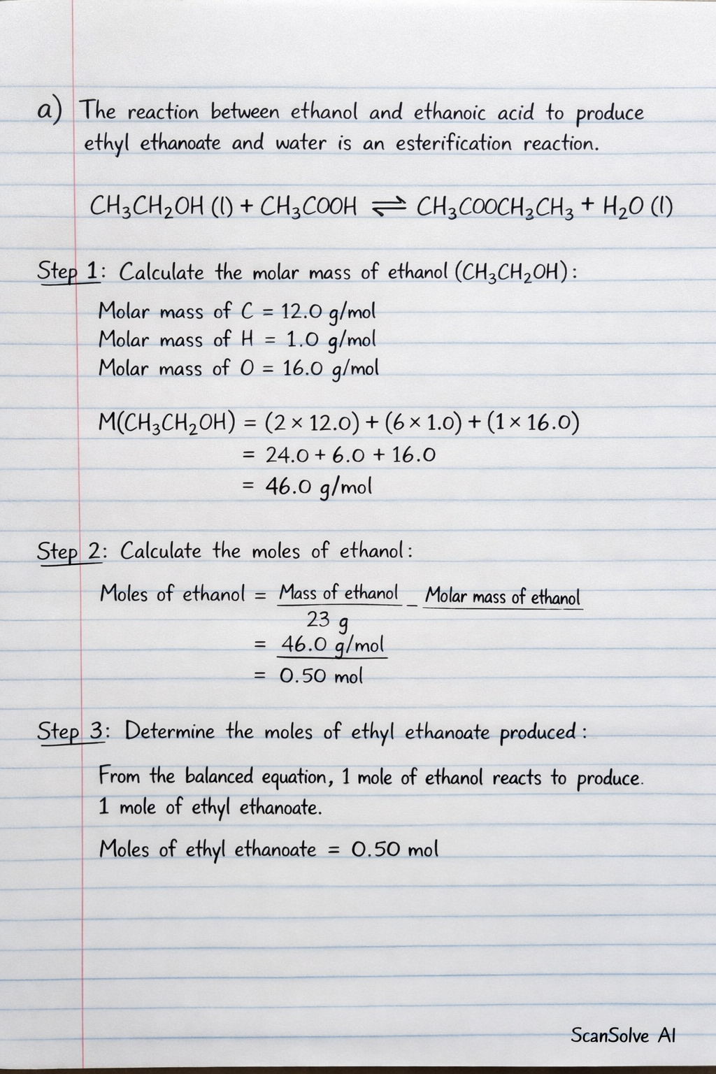 Step 3: Determine the moles of ethyl ethanoate produced.