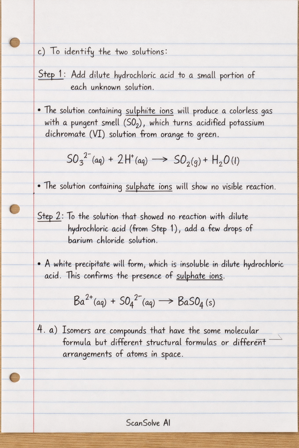• The solution containing sulphite ions will produce a colorless gas with a pungent smell (SO2), which turns acidified potassium dichromate(VI) solution from orange to green.