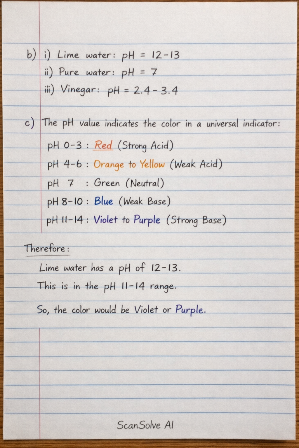 - (i) Lime water (calcium hydroxide solution) is a strong base. Its pH value is typically around 12−13.