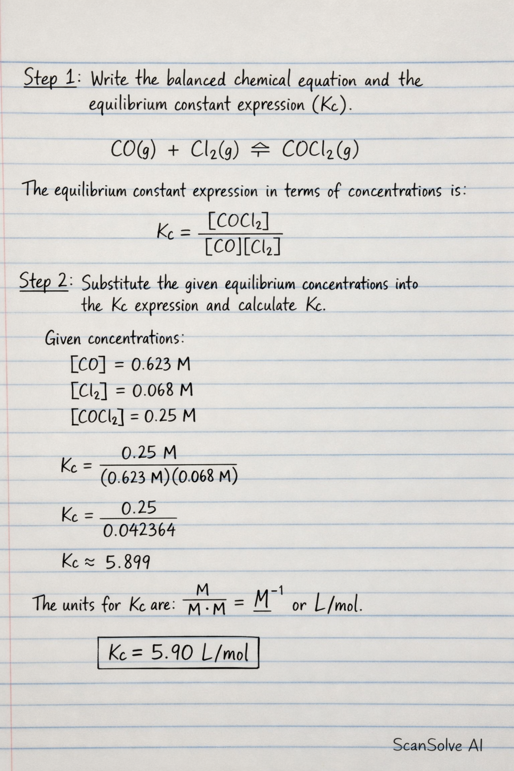 Step 2: Substitute the given equilibrium concentrations into the Kc expression and calculate Kc.