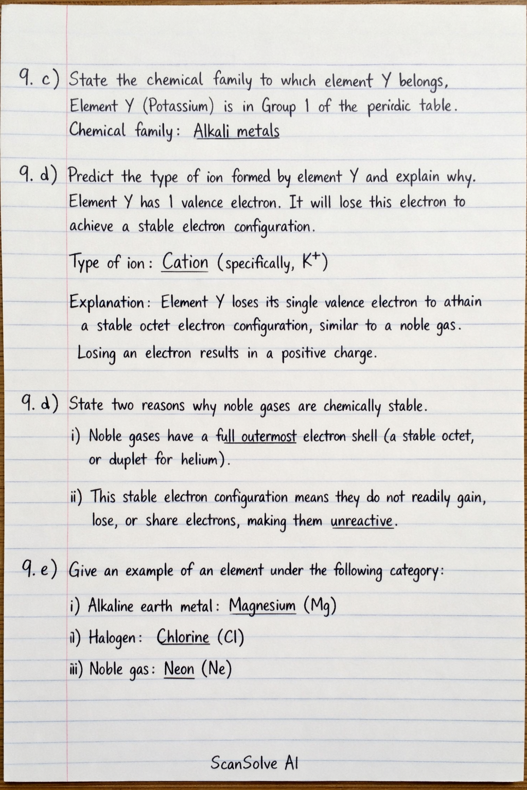 Verified9. c) State the chemical family to which element Y belongs. Element Y (Potassium) is in Group 1 of the periodic table.