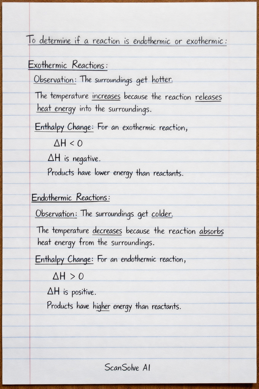 You can determine whether a reaction is endothermic or exothermic by observing the temperature change of the surroundings or by considering the enthalpy change ($\Delta H$) of the reaction.