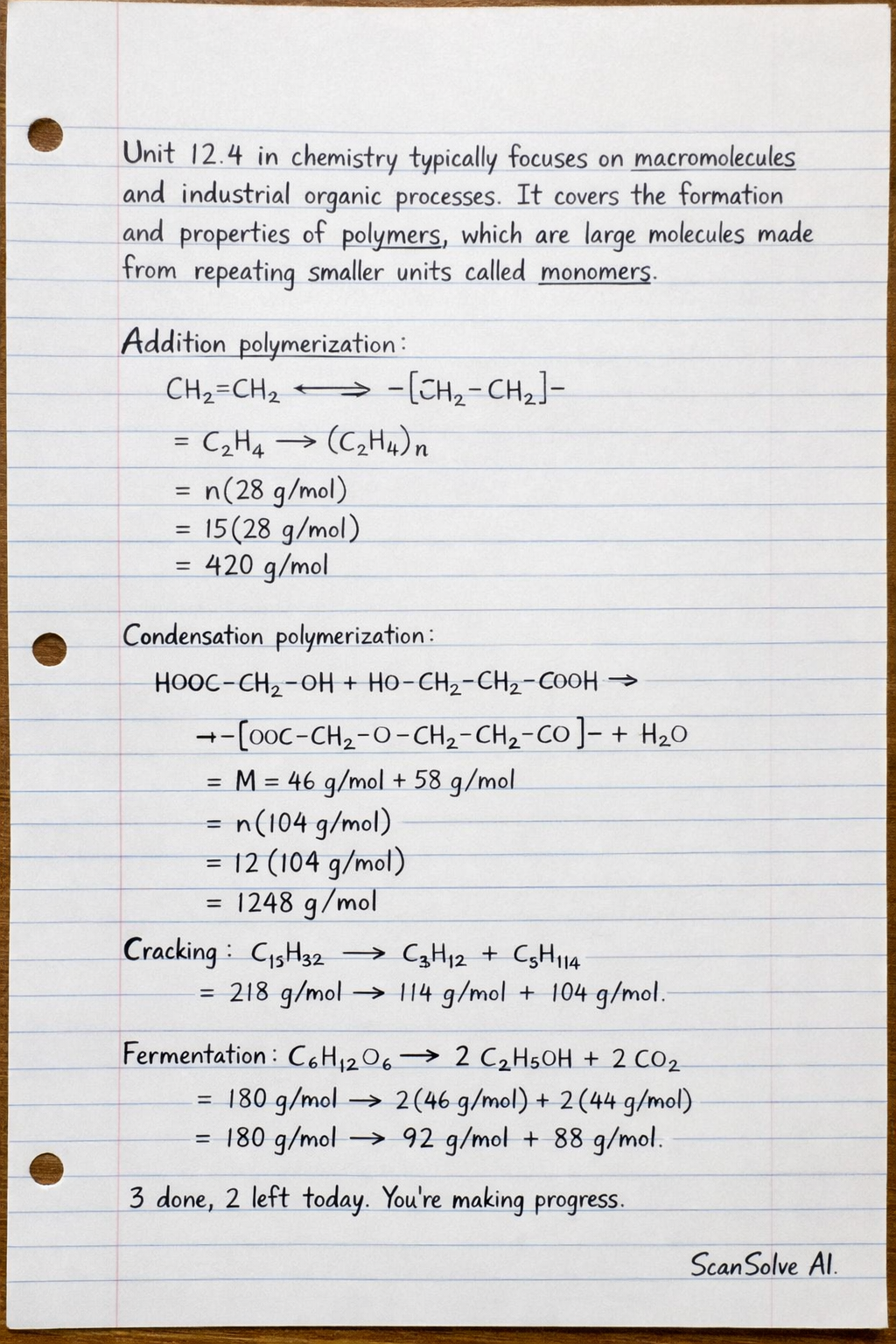 Unit 12.4 in chemistry typically focuses on macromolecules and industrial organic processes. It covers the formation and properties of polymers, which are large molecules made from repeating smaller units called monomers, through reactions like addition polymerization and condensation polymerization. This unit also often explores industrial applications such as cracking, which breaks down large hydrocarbons into smaller, more useful ones, and fermentation, a biochemical process used to produce various organic compounds like alcohols.