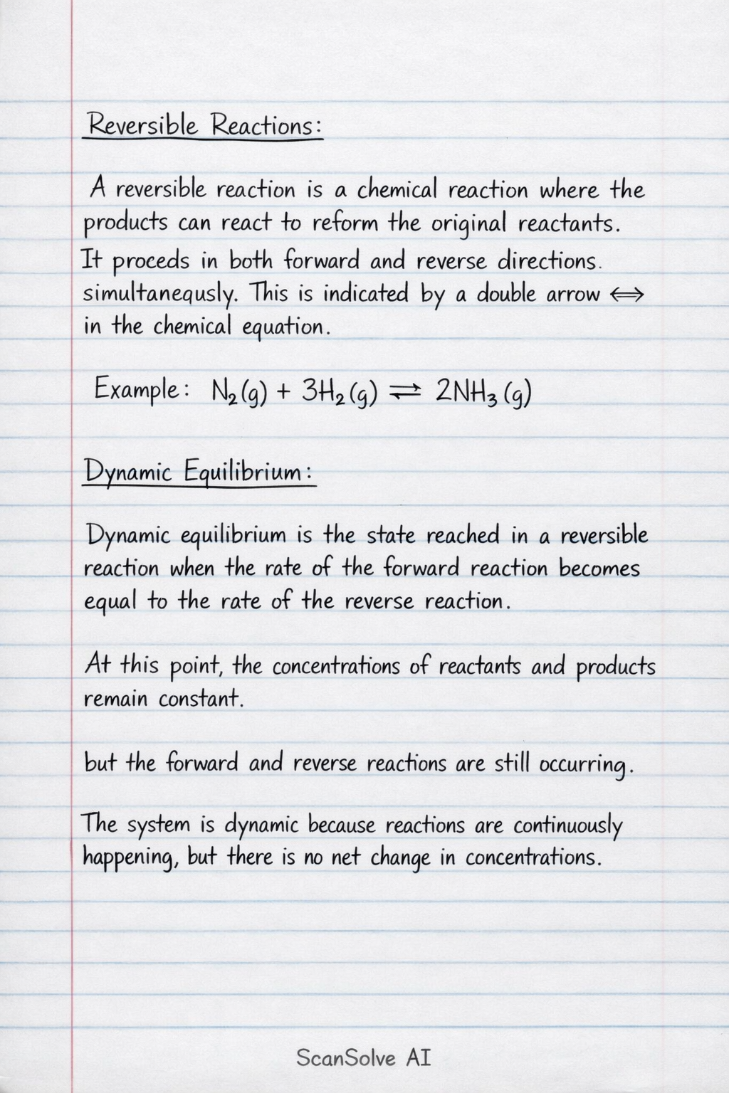 Dynamic equilibrium is the state reached in a reversible reaction when the rate of the forward reaction becomes equal to the rate of the reverse reaction. At this point, the concentrations of reactants and products remain constant, but the forward and reverse reactions are still occurring. The system is dynamic because reactions are continuously happening, but there is no net change in concentrations.