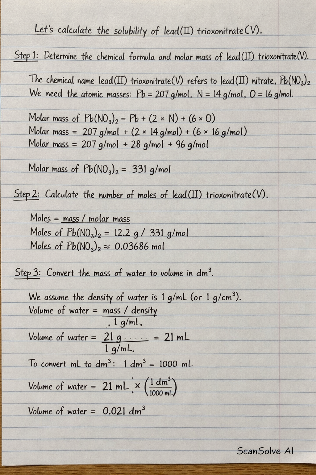 Step 4: Calculate the solubility in mol dm⁻³. Solubility = moles of solute / volume of solvent (in dm³) Solubility = 0.03686 mol / 0.021 dm³ Solubility ≈ 1.755 mol/dm³ Rounding to two significant figures (based on the given mass of 21 g of water): Solubility = \text{1.8 mol/dm^3} 3 done, 2 left today. You're making progress.