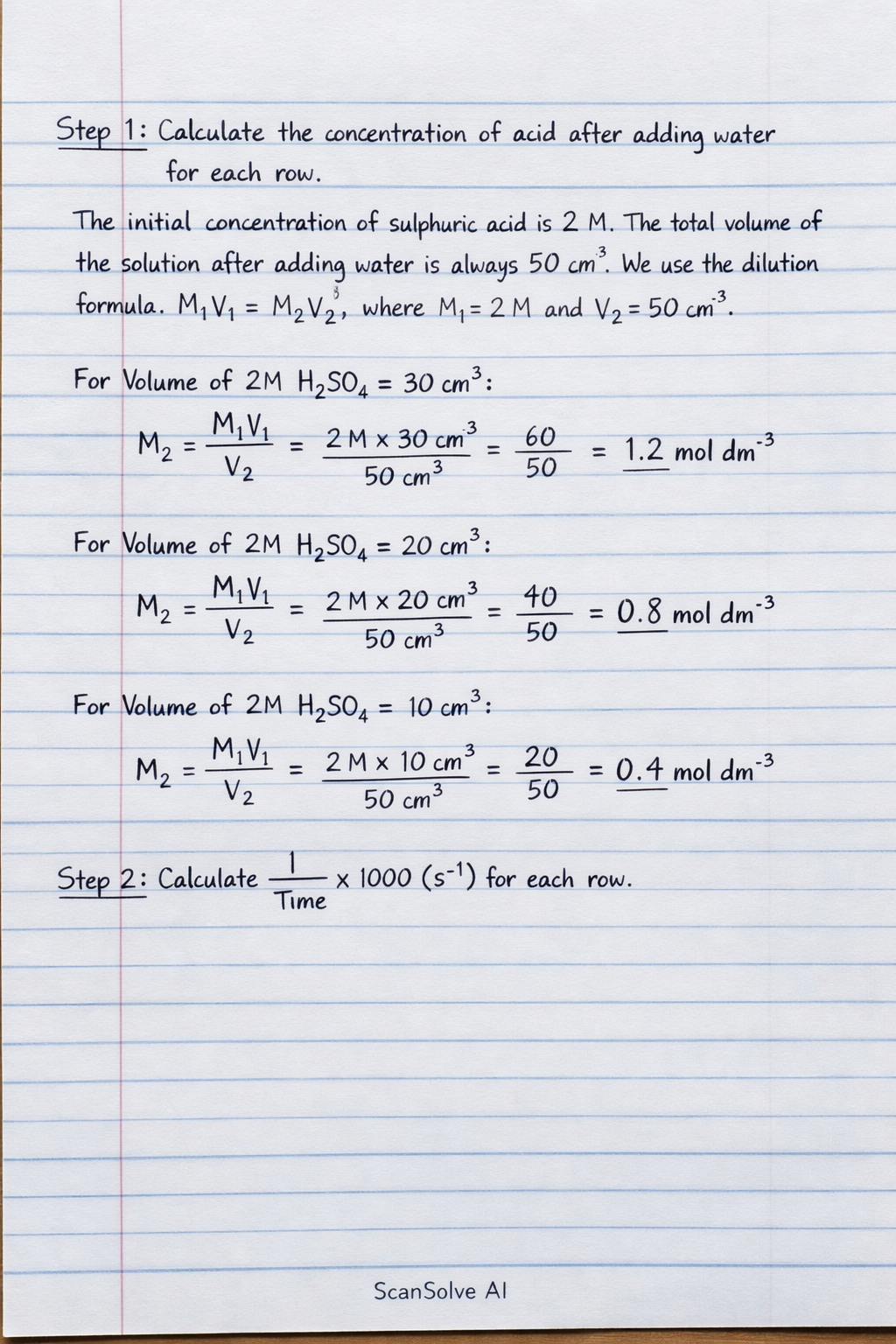 The initial concentration of sulphuric acid is 2 M. The total volume of the solution after adding water is always 50cm3. We use the dilution formula M1V1=M2V2, where M1=2 M and V2=50cm3.