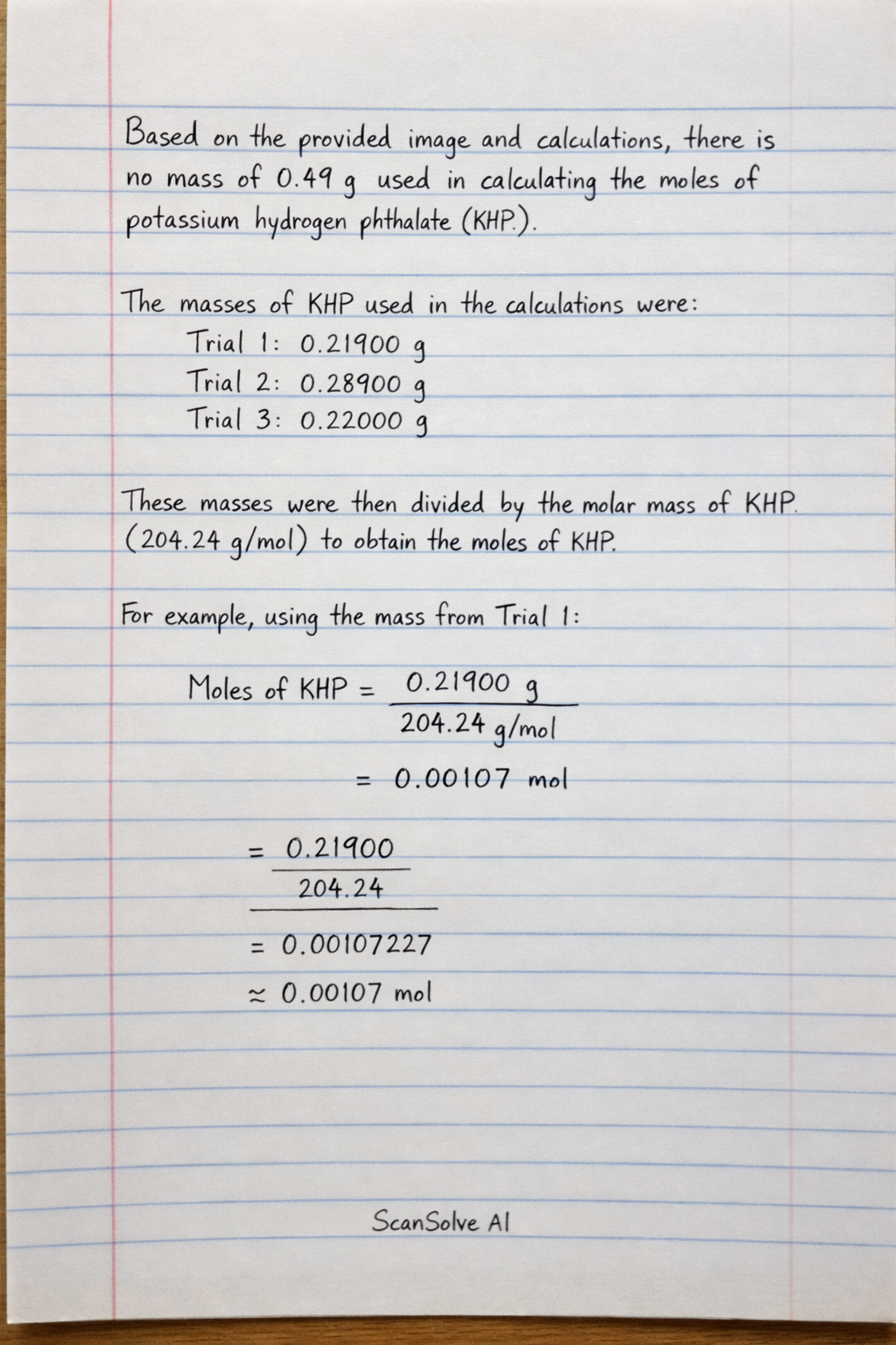 These masses were then divided by the molar mass of KHP () to obtain the moles of KHP.