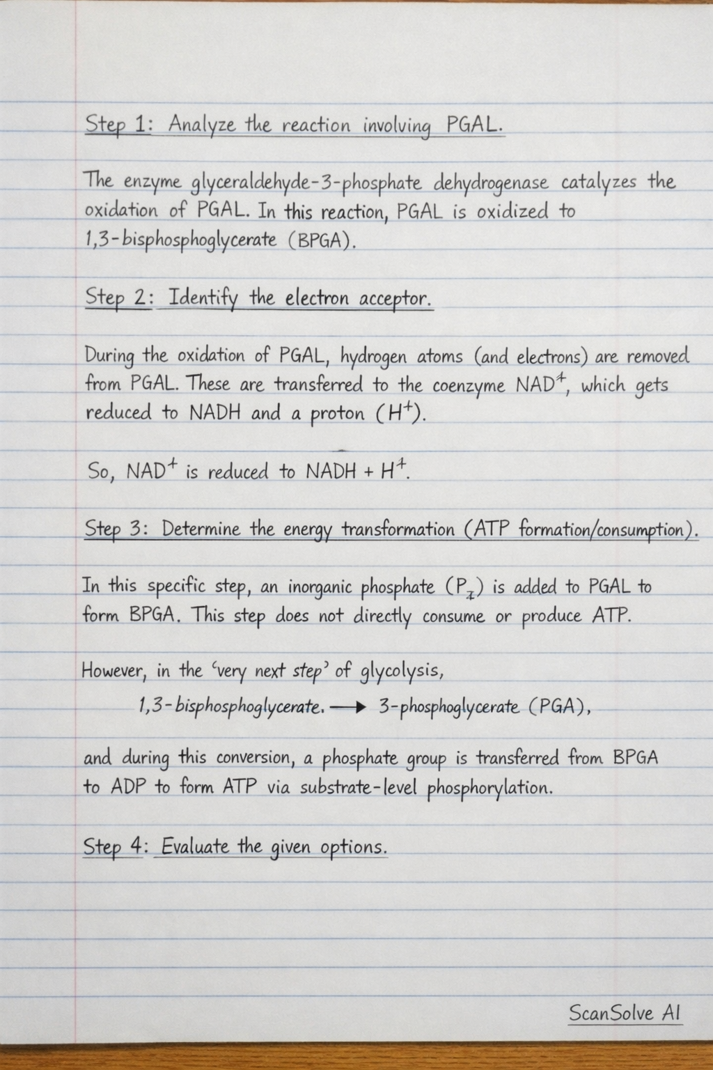 (B) PGAL is oxidized to BPGA, NAD+ is reduced to NADH + H+, and ATP is directly formed in this step.
