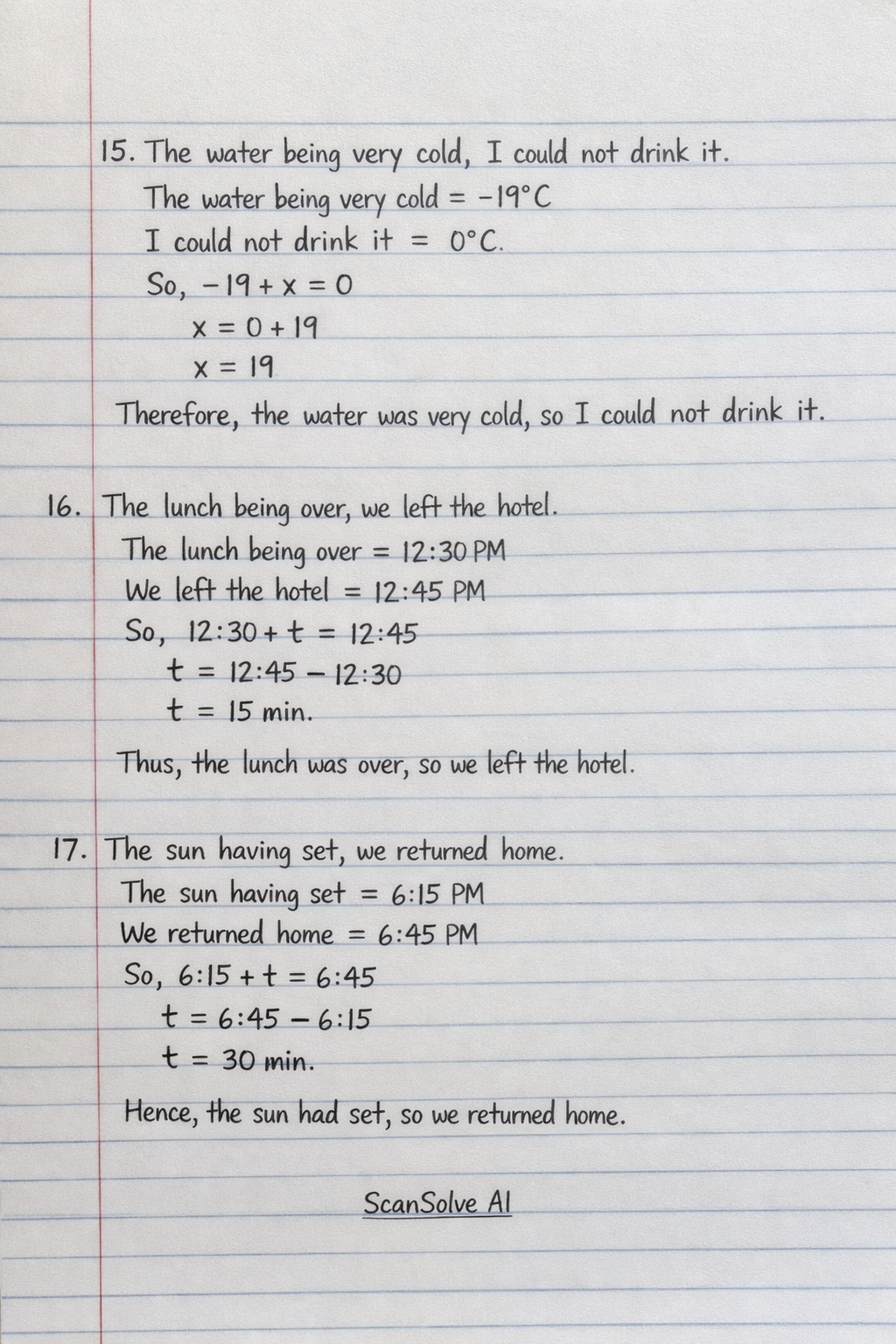 17. Simple: The sun having set, we returned home.