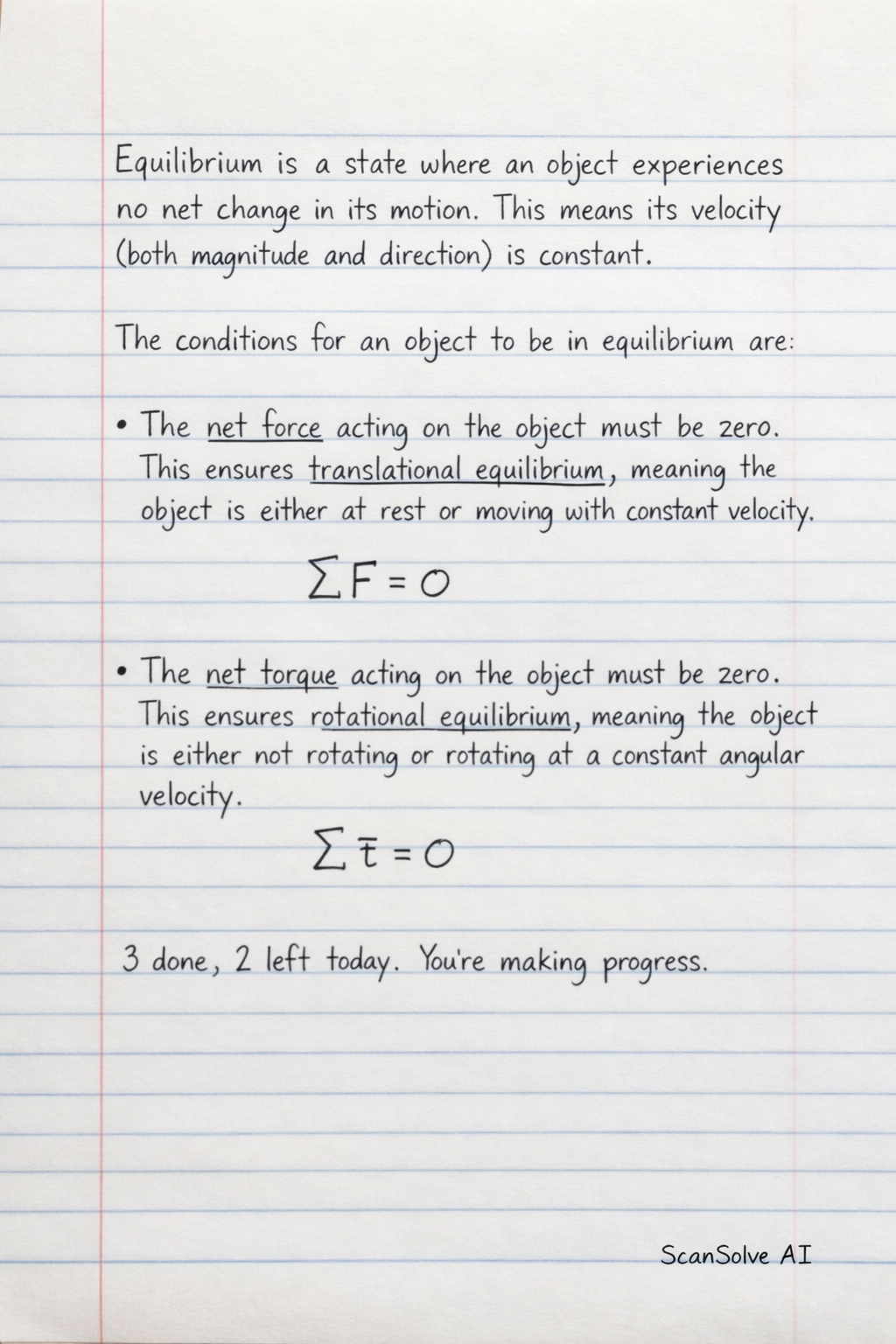 The conditions for an object to be in equilibrium are: • The net force acting on the object must be zero. This ensures translational equilibrium, meaning the object is either at rest or moving with constant velocity. • The net torque acting on the object must be zero. This ensures rotational equilibrium, meaning the object is either not rotating or rotating at a constant angular velocity.