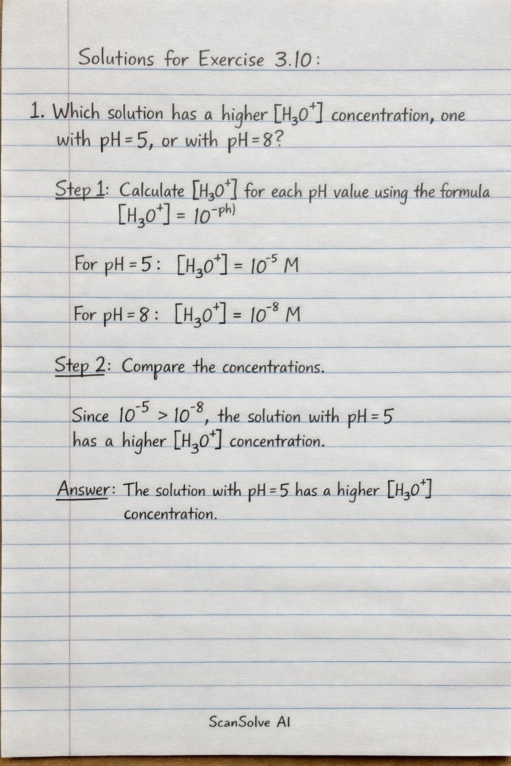 Answer: The solution with pH=5 has a higher [H3O+] concentration.