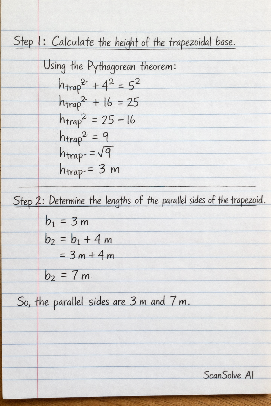 Step 1: Calculate the height of the trapezoidal base. From the diagram, we can form a right-angled triangle within the trapezoid. The hypotenuse is the slanted side (5 m), and one leg is the horizontal difference between the parallel sides (implied as 4 m from the student's calculation ). Let be the height of the trapezoid. Using the Pythagorean theorem: