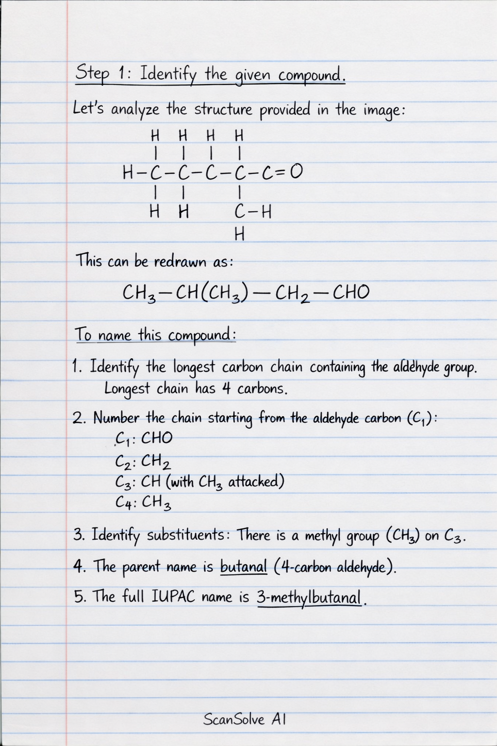 Step 1: Identify the given compound. Let's analyze the structure provided in the image: This can be redrawn to clearly show the carbon chain and substituents: To name this compound: