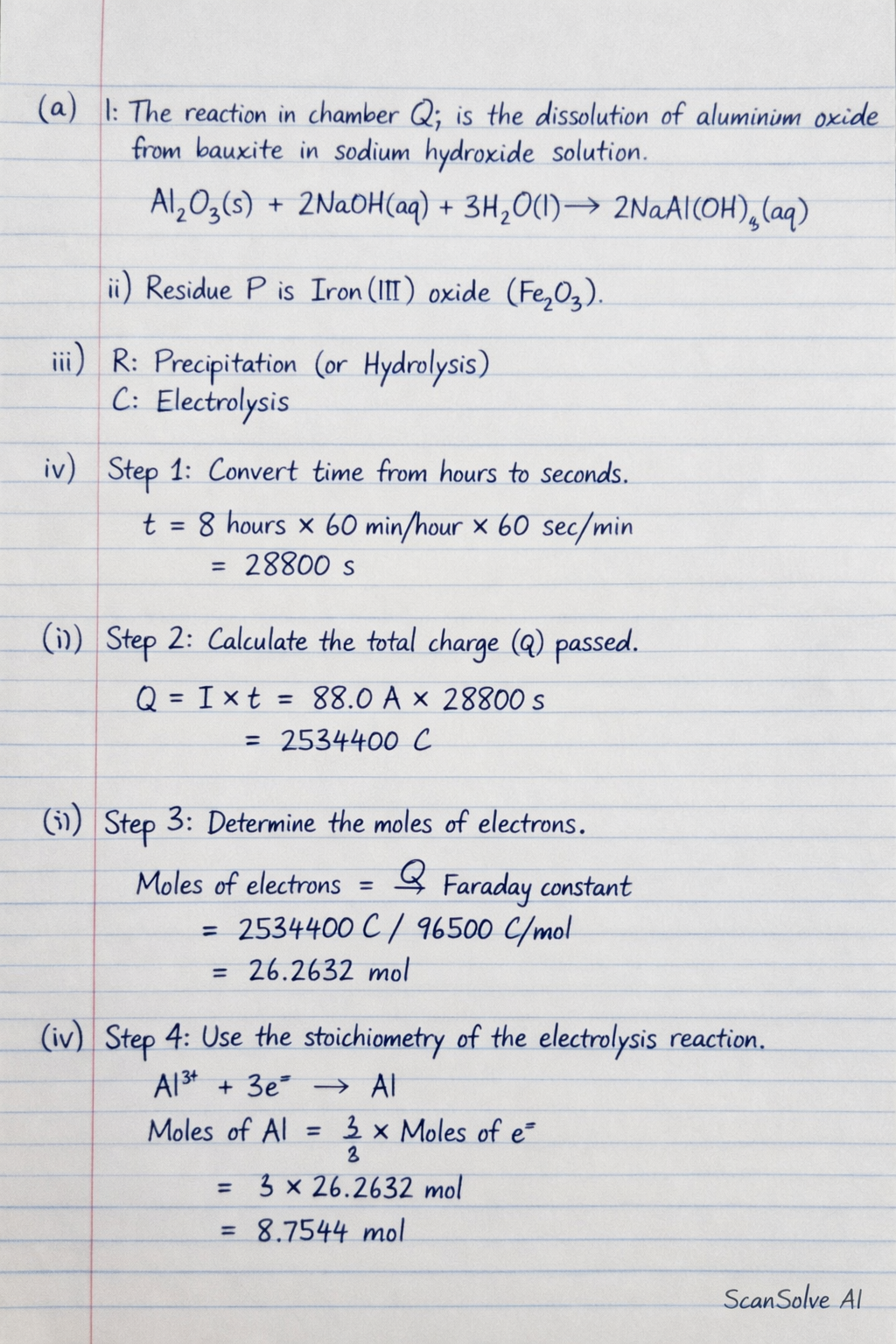 iv) Step 1: Convert time from hours to seconds. Step 2: Calculate the total charge (Q) passed. Step 3: Determine the moles of electrons. Step 4: Use the stoichiometry of the electrolysis reaction () to find moles of aluminium. Step 5: Calculate the mass of aluminium produced. The mass of aluminium produced is .