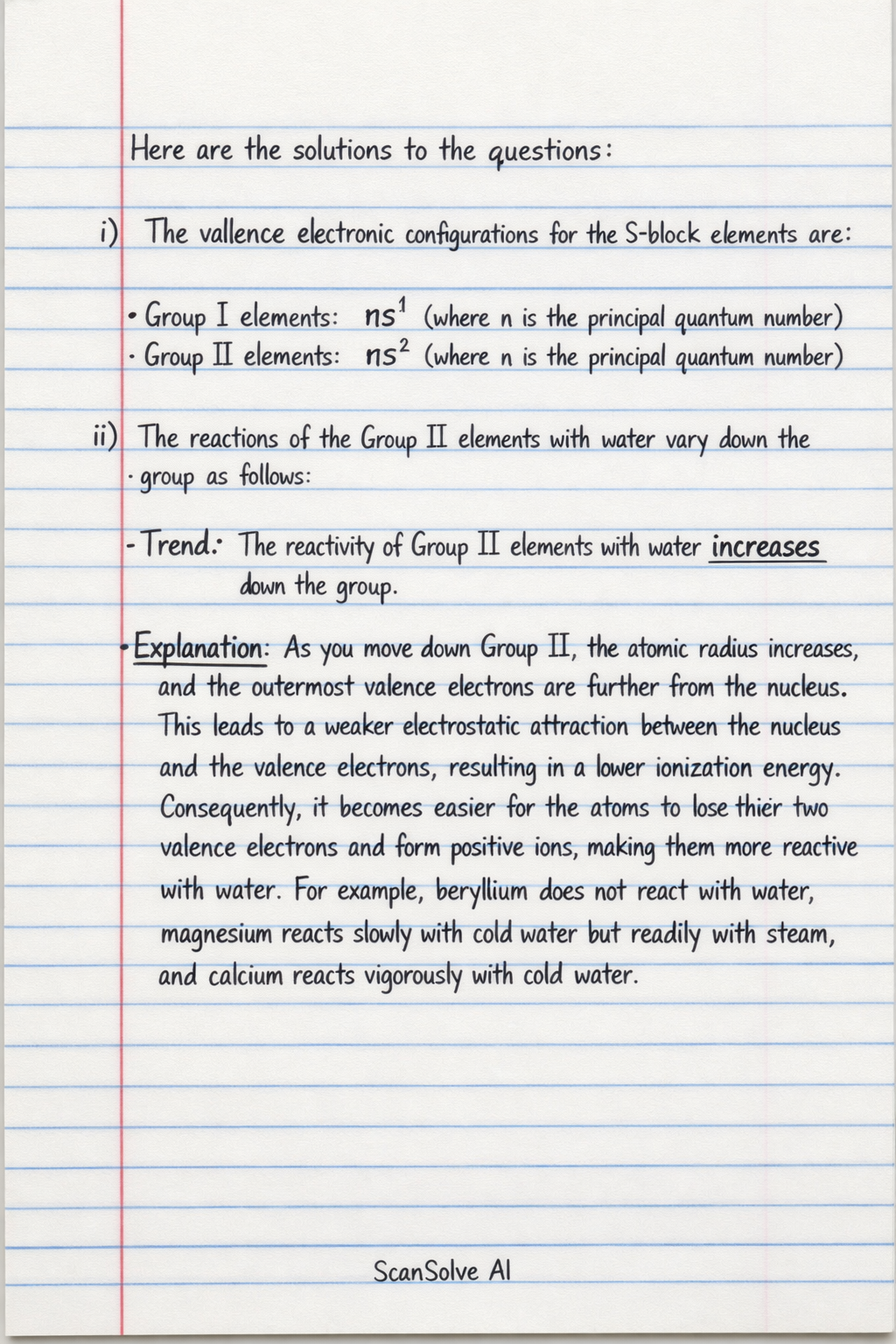 - Explanation: As you move down Group II, the atomic radius increases, and the outermost valence electrons are further from the nucleus. This leads to a weaker electrostatic attraction between the nucleus and the valence electrons, resulting in a lower ionization energy. Consequently, it becomes easier for the atoms to lose their two valence electrons and form positive ions, making them more reactive with water. For example, beryllium does not react with water, magnesium reacts slowly with cold water but readily with steam, and calcium reacts vigorously with cold water.