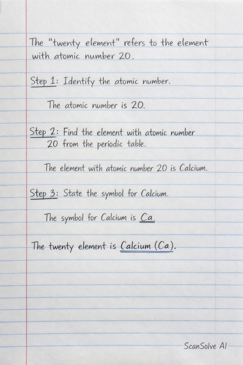 Step 2: Find the element with atomic number 20 from the periodic table. The element with atomic number is Calcium.