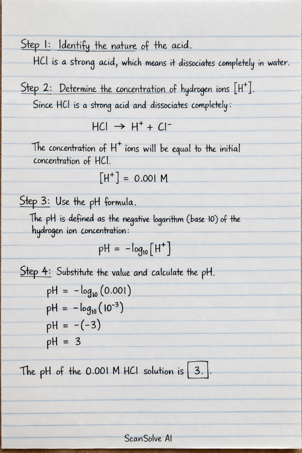 Step 3: Use the pH formula. The pH is defined as the negative logarithm (base 10) of the hydrogen ion concentration: