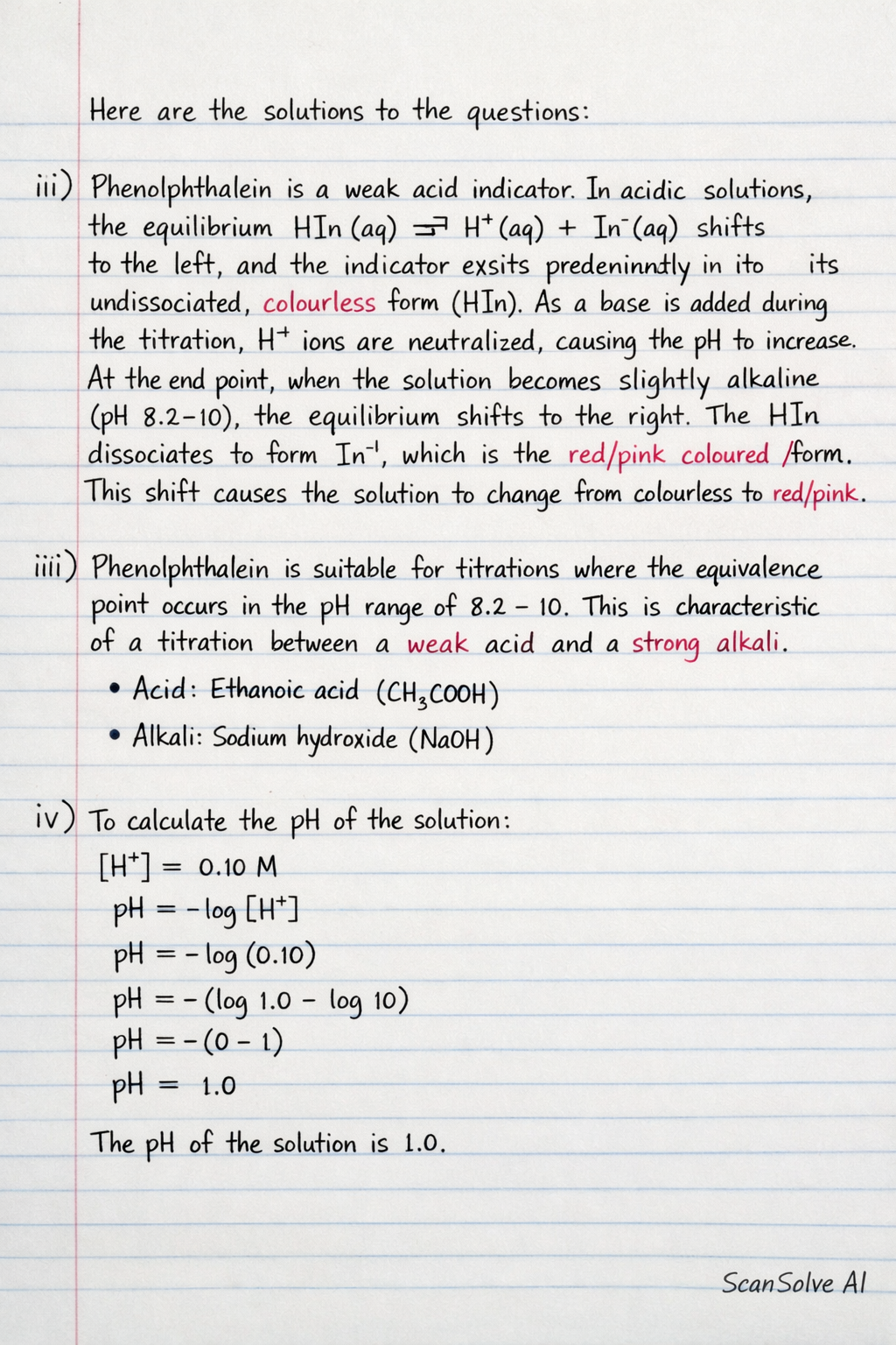 ii) Phenolphthalein is a weak acid indicator. In acidic solutions, the equilibrium HIn(aq)⇌H+(aq)+In−(aq) shifts to the left, and the indicator exists predominantly in its undissociated, colourless form (HIn). As a base is added during the titration, H+ ions are neutralized, causing the pH to increase. At the end point, when the solution becomes slightly alkaline (pH 8.2-10), the equilibrium shifts to the right. The HIn dissociates to form In−, which is the red/pink coloured form. This shift causes the solution to change from colourless to red/pink.