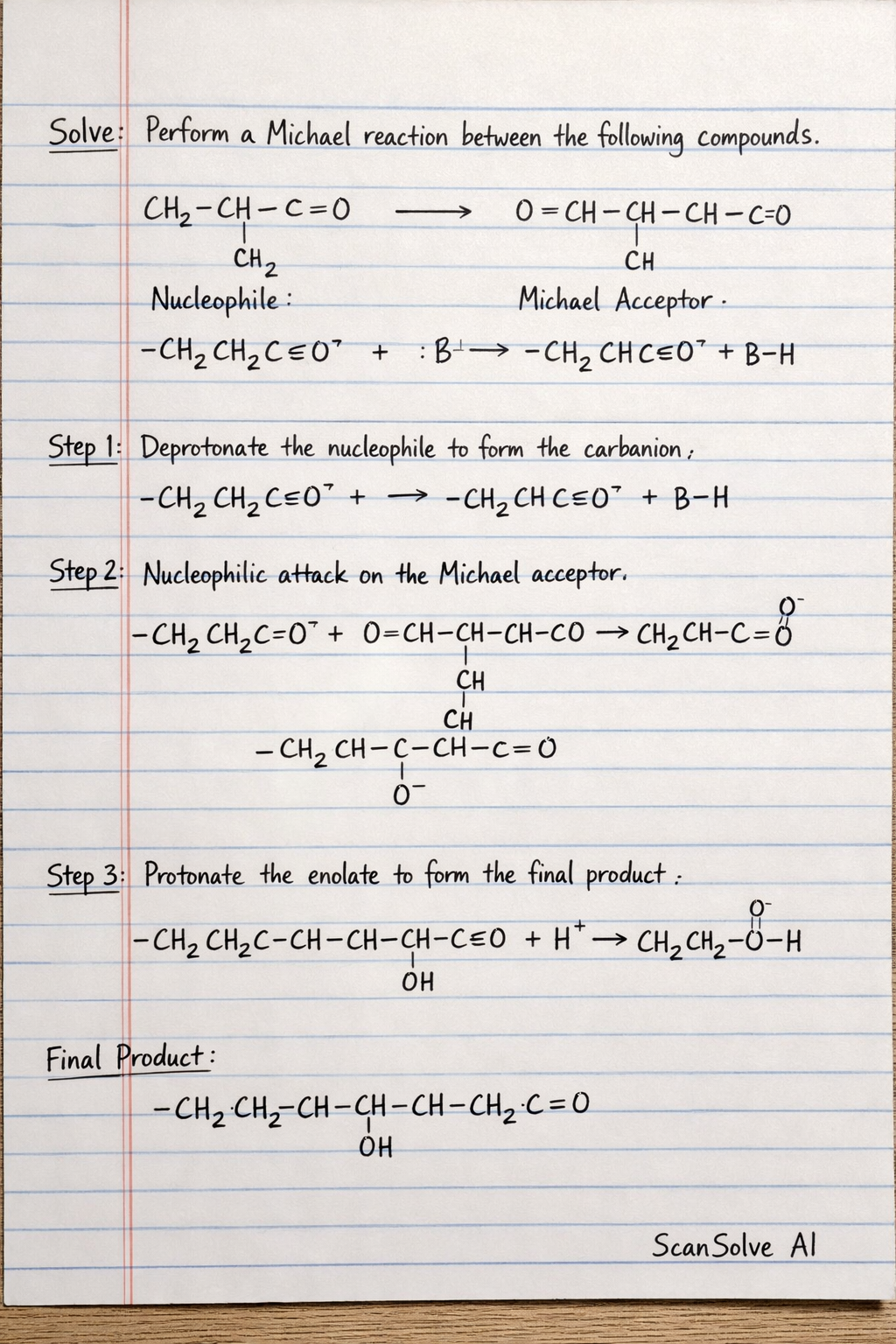 The Michael reaction is a type of conjugate addition reaction used in organic synthesis to form new carbon-carbon bonds. It involves an electron-rich molecule (a nucleophile, often a carbanion) adding to the -carbon of an electron-poor molecule (a Michael acceptor, which is an -unsaturated carbonyl compound). This process effectively joins two smaller molecules into a larger one.