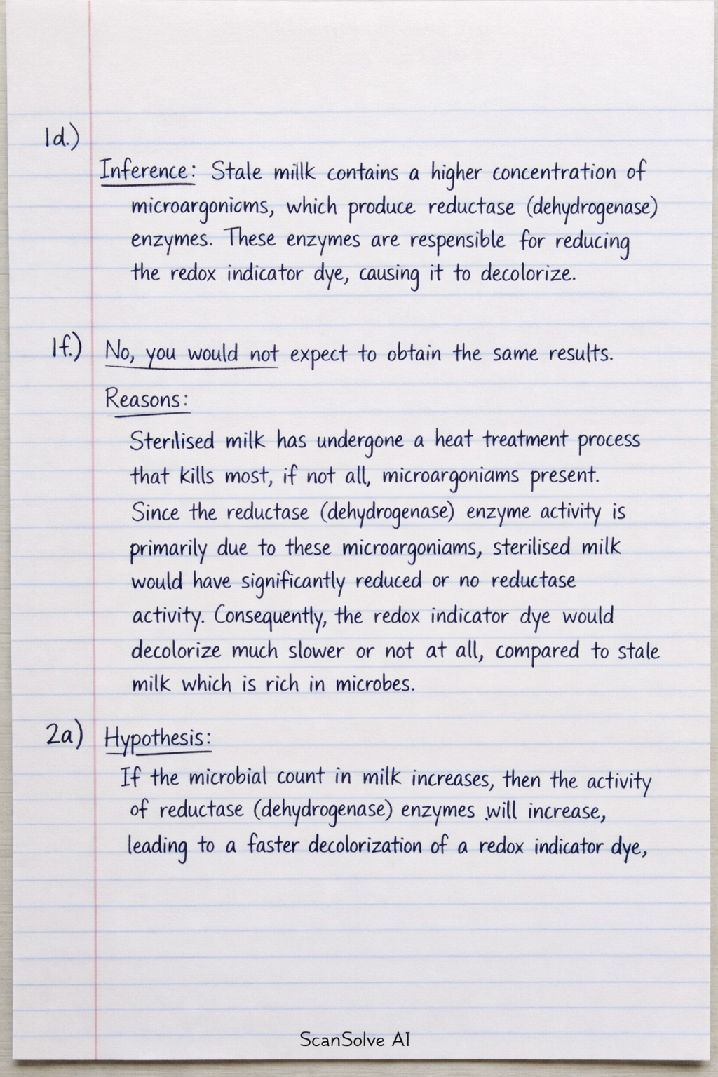- Materials: Fresh milk, stale milk, sterilised milk, methylene blue solution, three test tubes, measuring cylinder/pipette, water bath (e.g., set to 37∘C), stopwatch.