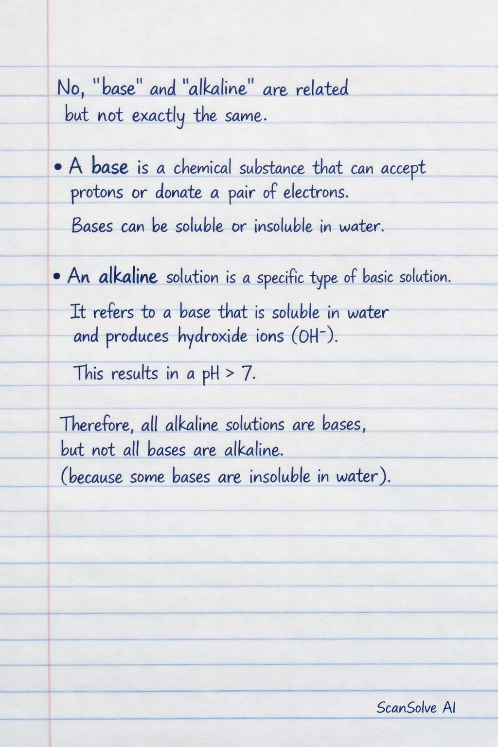 Therefore, all alkaline solutions are bases, but not all bases are alkaline (because some bases are insoluble in water).
