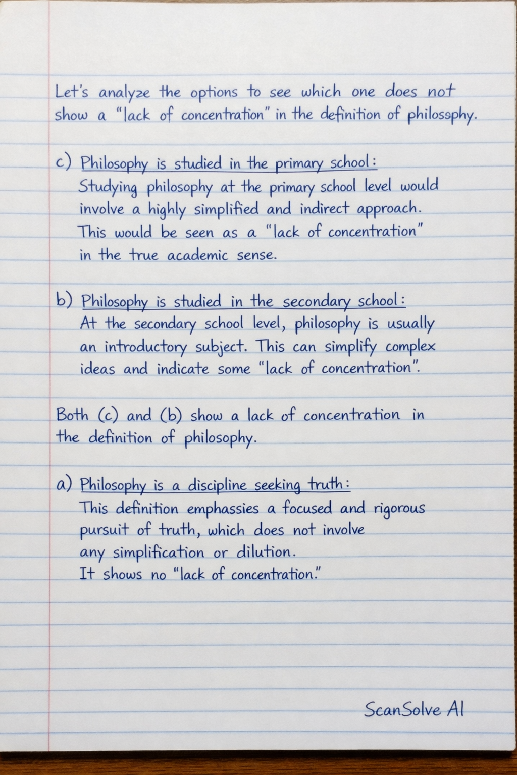 - b) The fact that philosophy is a subject that is studied in the secondary school: While more advanced than primary school, philosophy in secondary school is often still an introduction or survey, potentially simplifying complex ideas and thus showing some "lack of concentration" compared to its full academic scope.