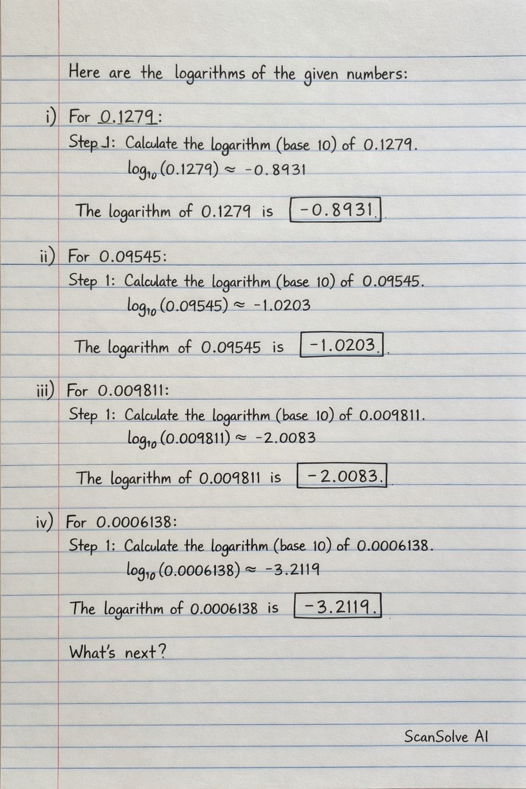 i) For : Step 1: Calculate the logarithm (base 10) of . The logarithm of is .