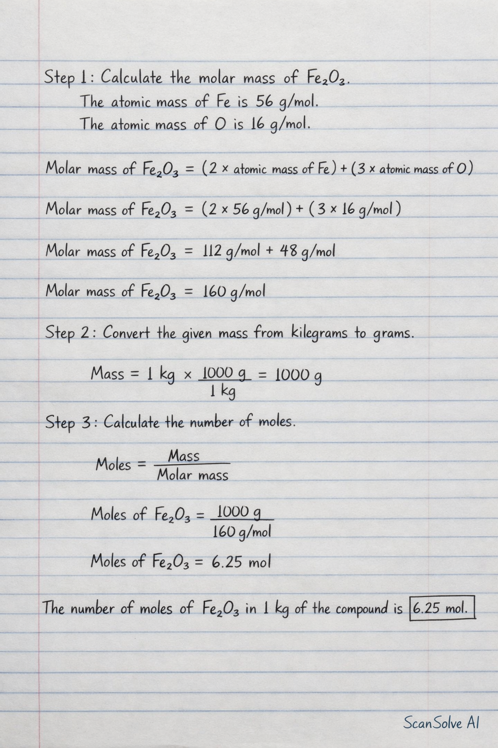 MolarmassofFe2O3=(2×56g/mol)+(3×16g/mol)