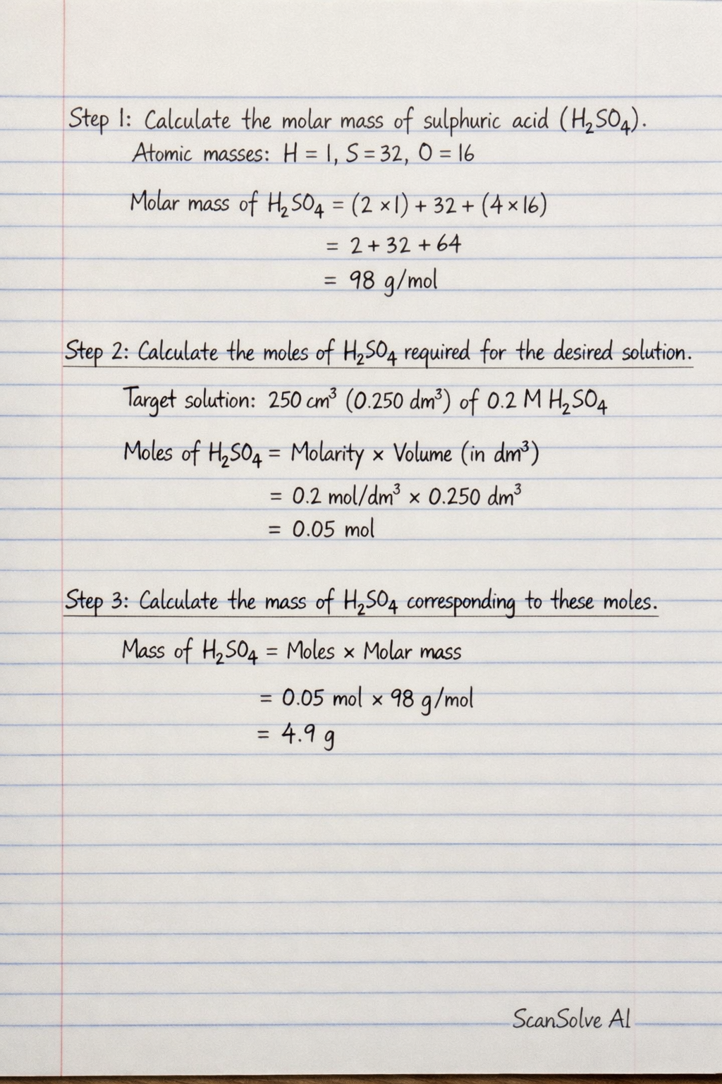 Step 1: Calculate the molar mass of sulphuric acid (). The atomic masses are given as H=1, S=32, O=16.