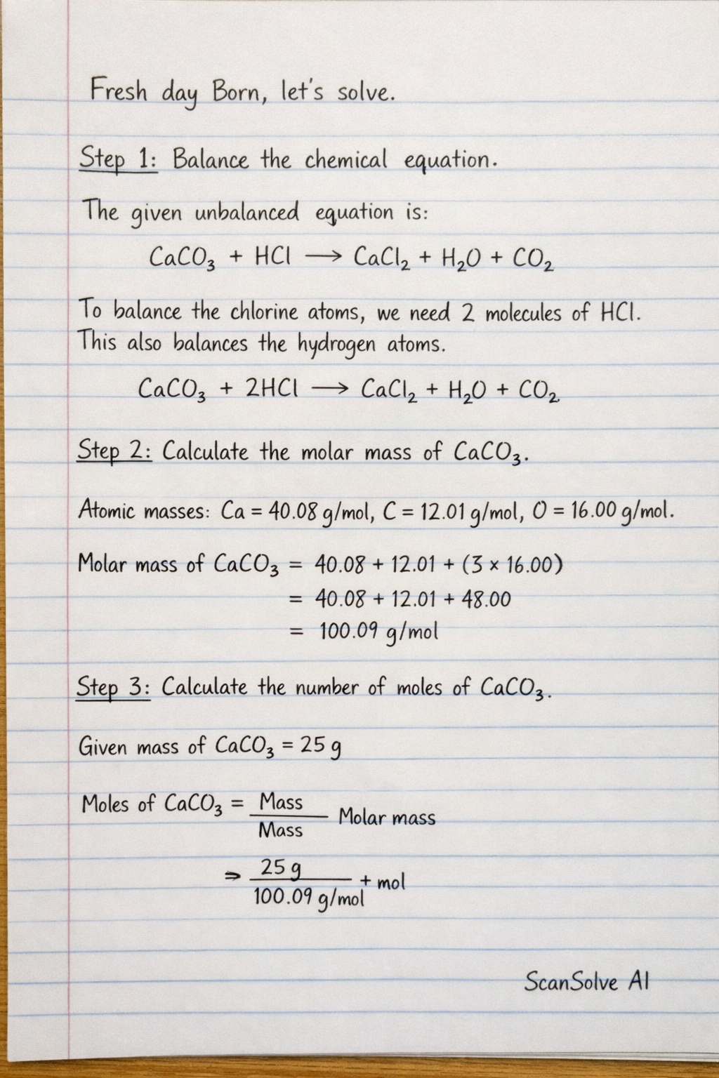 Step 2: Calculate the molar mass of . Atomic masses: Ca = 40.08 g/mol, C = 12.01 g/mol, O = 16.00 g/mol. Molar mass of .