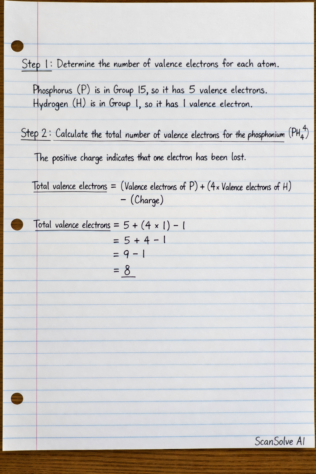 Step 2: Calculate the total number of valence electrons for the phosphonium ion (). The positive charge indicates that one electron has been lost.