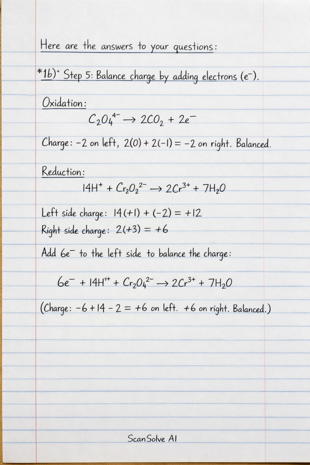 6e−+14H++Cr2O72−→2Cr3++7H2O (Charge: −6+14−2=+6 on left. +6 on right. Balanced.)