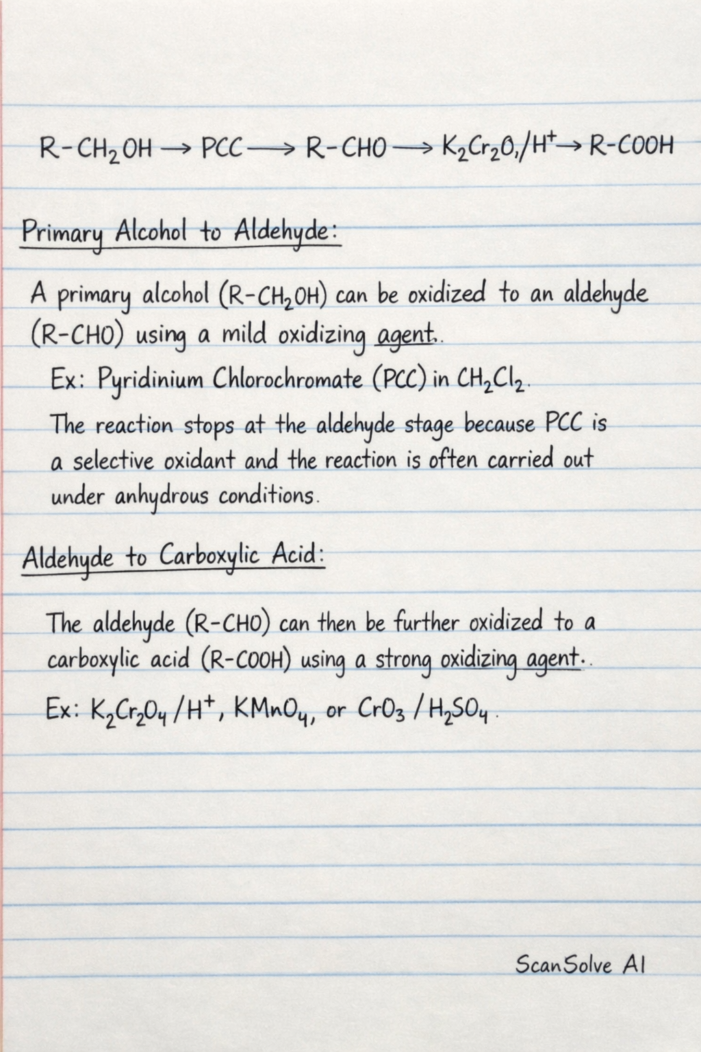 Primary Alcohol to Aldehyde: A primary alcohol ($\text{R-CH}_2\text{OH}$) can be oxidized to an aldehyde ($\text{R-CHO}$) using a mild oxidizing agent*. Examples include Pyridinium Chlorochromate (PCC) in dichloromethane. This reaction stops at the aldehyde stage because PCC is a selective oxidant and the reaction is often carried out under anhydrous conditions.