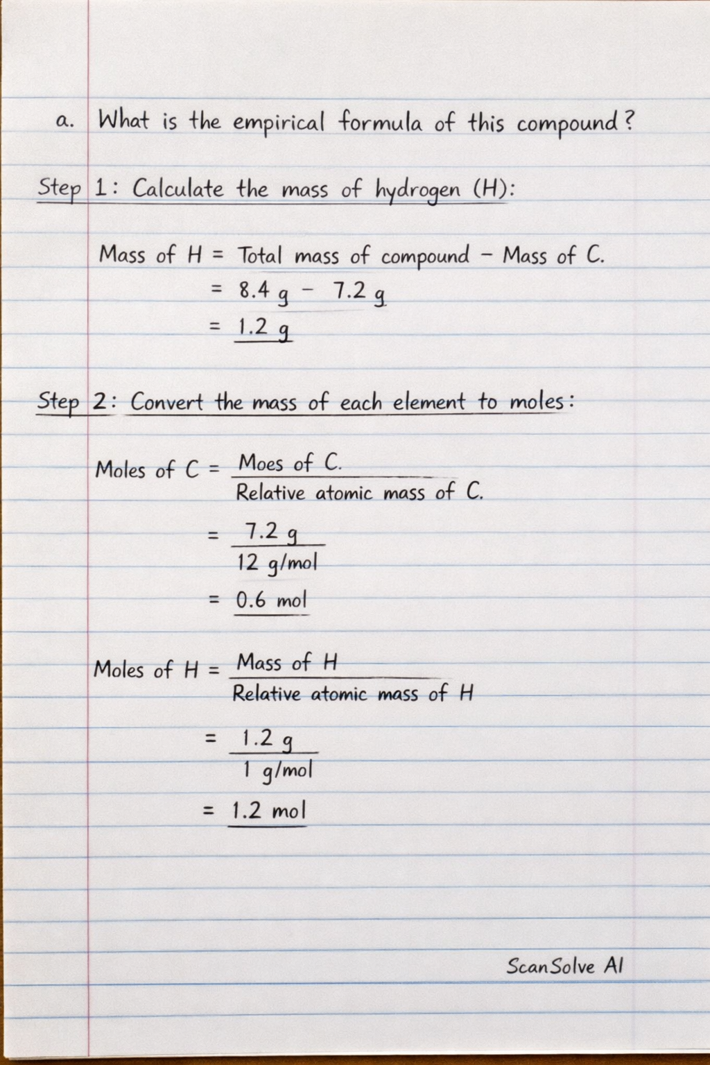 MassofH=Totalmassofcompound−MassofCMassofH=8.4g−7.2gMassofH=1.2g