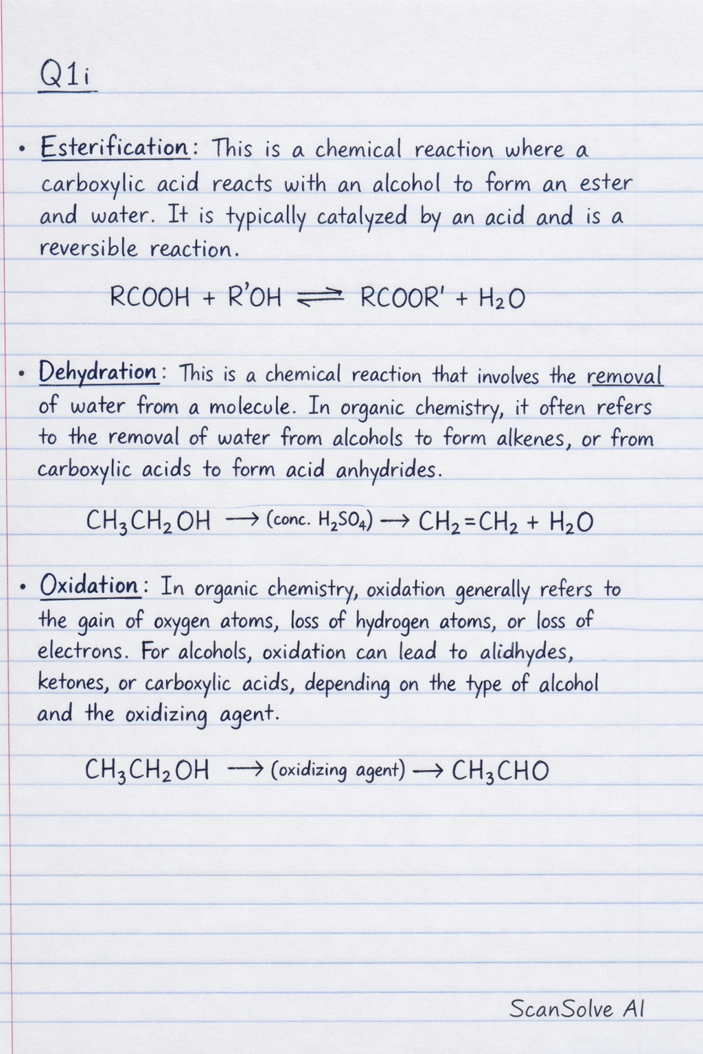 Oxidation: In organic chemistry, oxidation generally refers to the gain of oxygen atoms, loss of hydrogen atoms, or loss of electrons*. For alcohols, oxidation can lead to aldehydes, ketones, or carboxylic acids, depending on the type of alcohol and the oxidizing agent.