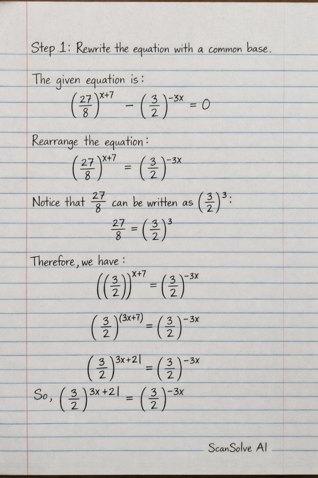 $$ \left(\frac{27}{8}\right)^{x+7} - \left(\frac{3}{2}\right)^{-3x} = 0 $$