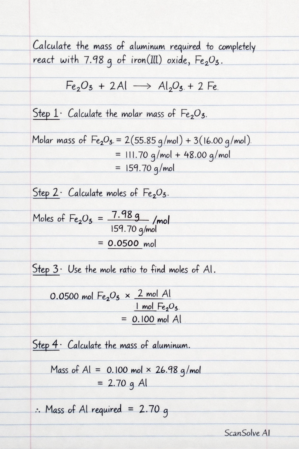 ii) Calculate the mass of aluminum required to completely react with 7.98g of iron (II) oxide, . Reaction: Atomic masses: Fe = 55.85 g/mol, O = 16.00 g/mol, Al = 26.98 g/mol