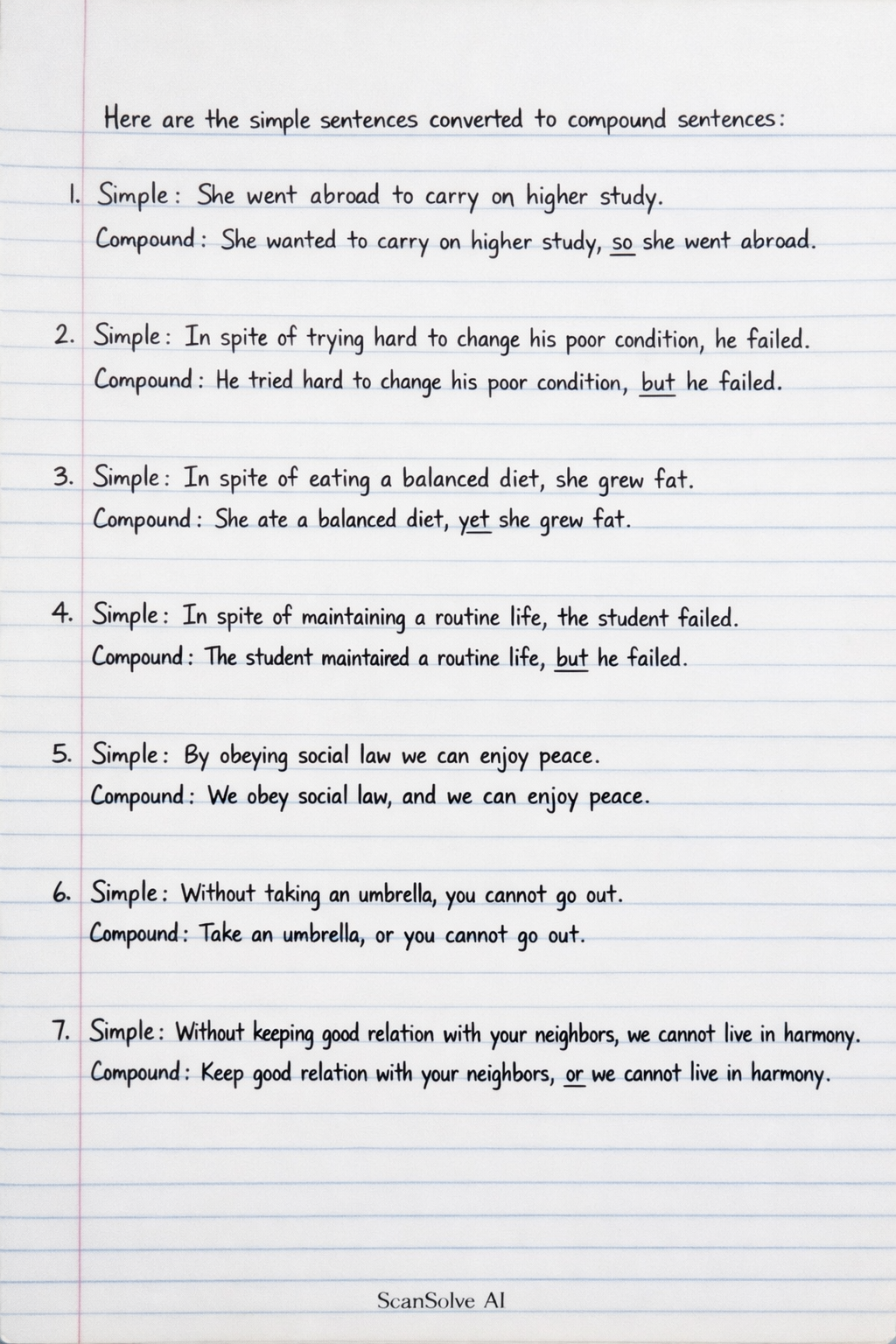Here are the simple sentences converted to compound sentences: