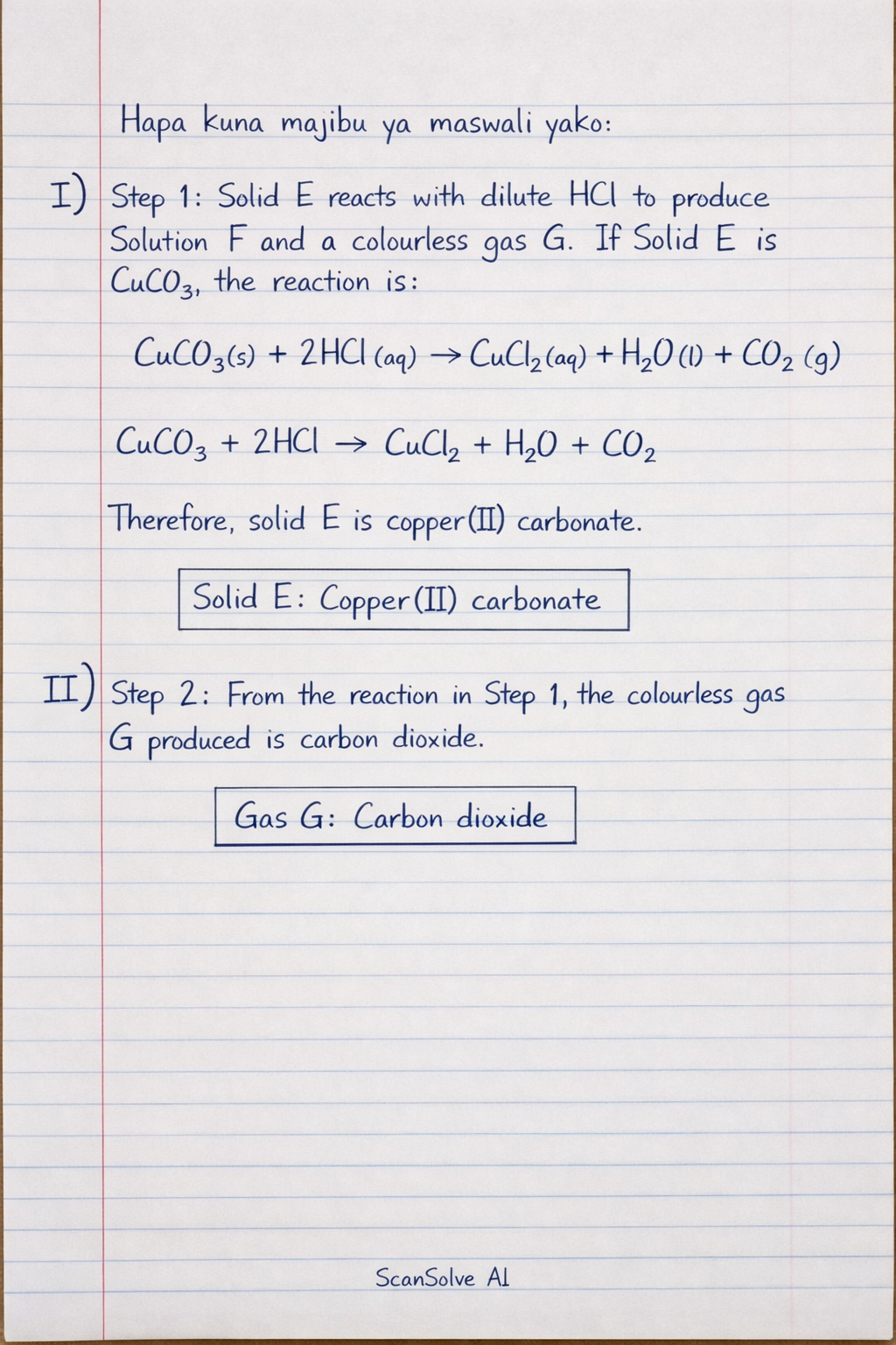 Hapa kuna majibu ya maswali yako: I) Step 1: Solid E reacts with dilute hydrochloric acid to produce Solution F and a colourless gas G.