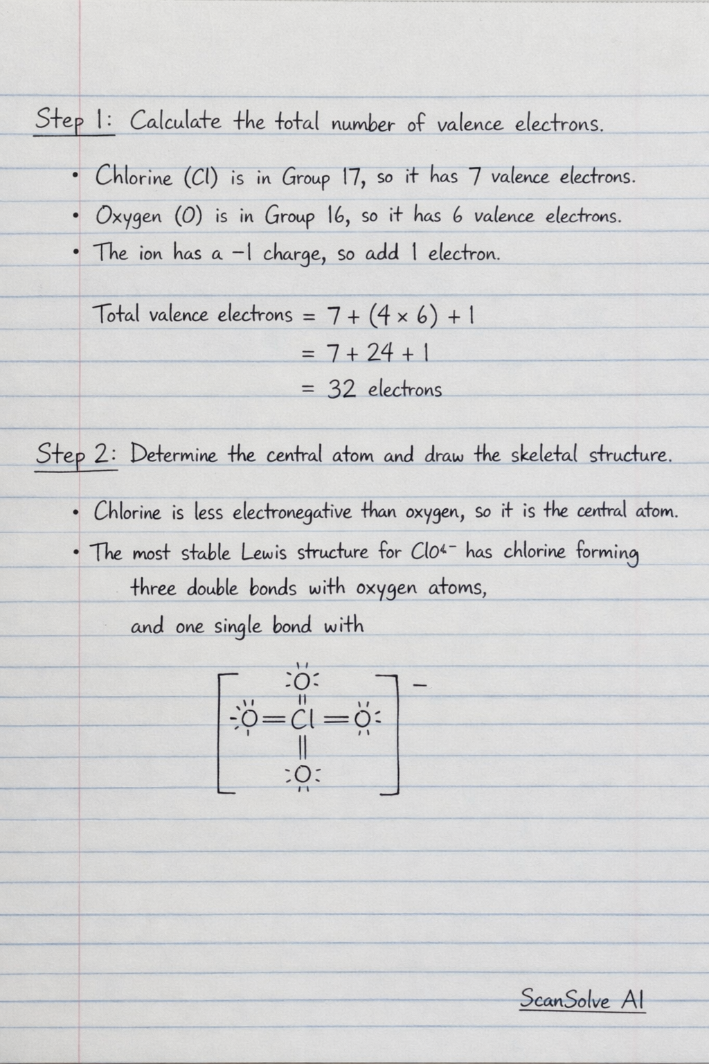Step 1: Calculate the total number of valence electrons. Chlorine (Cl) is in Group 17, so it has 7 valence electrons. Oxygen (O) is in Group 16, so it has 6 valence electrons. The ion has a -1 charge, so add 1 electron. Total valence electrons = electrons.