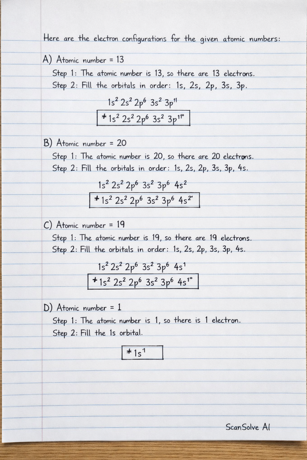 C) Atomic number = 19 Step 1: The atomic number is 19, so there are 19 electrons. Step 2: Fill the orbitals in order: , , , , , .