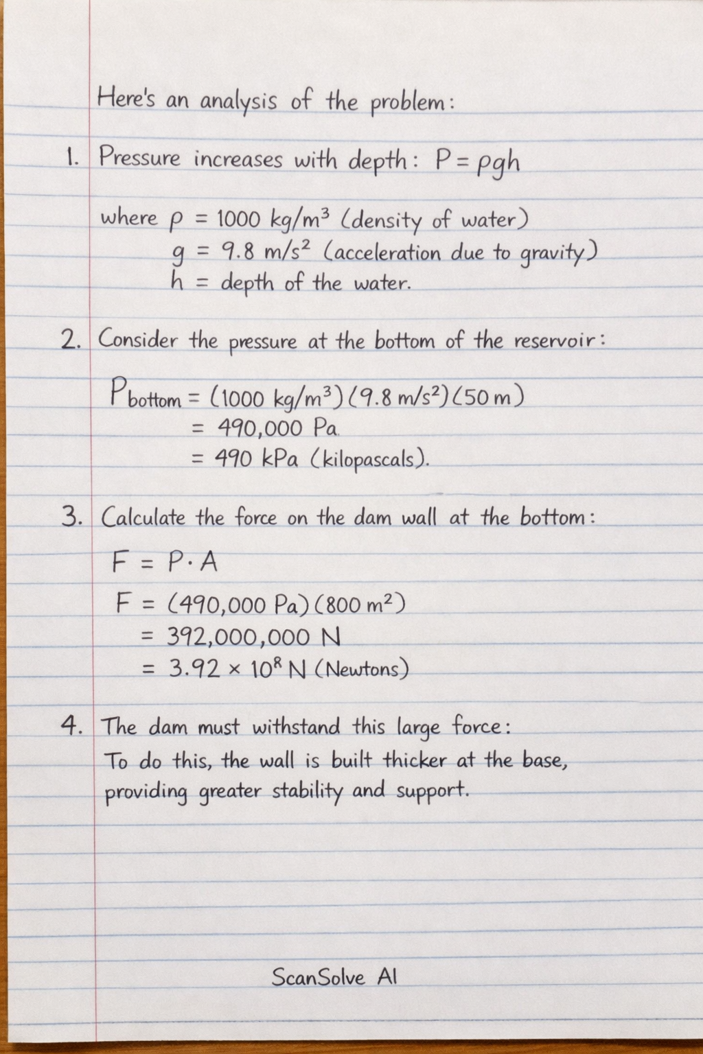 The diagram shows a cross-section of a dam holding back water in a reservoir. The dam wall is constructed with a wider base and tapers towards the top.