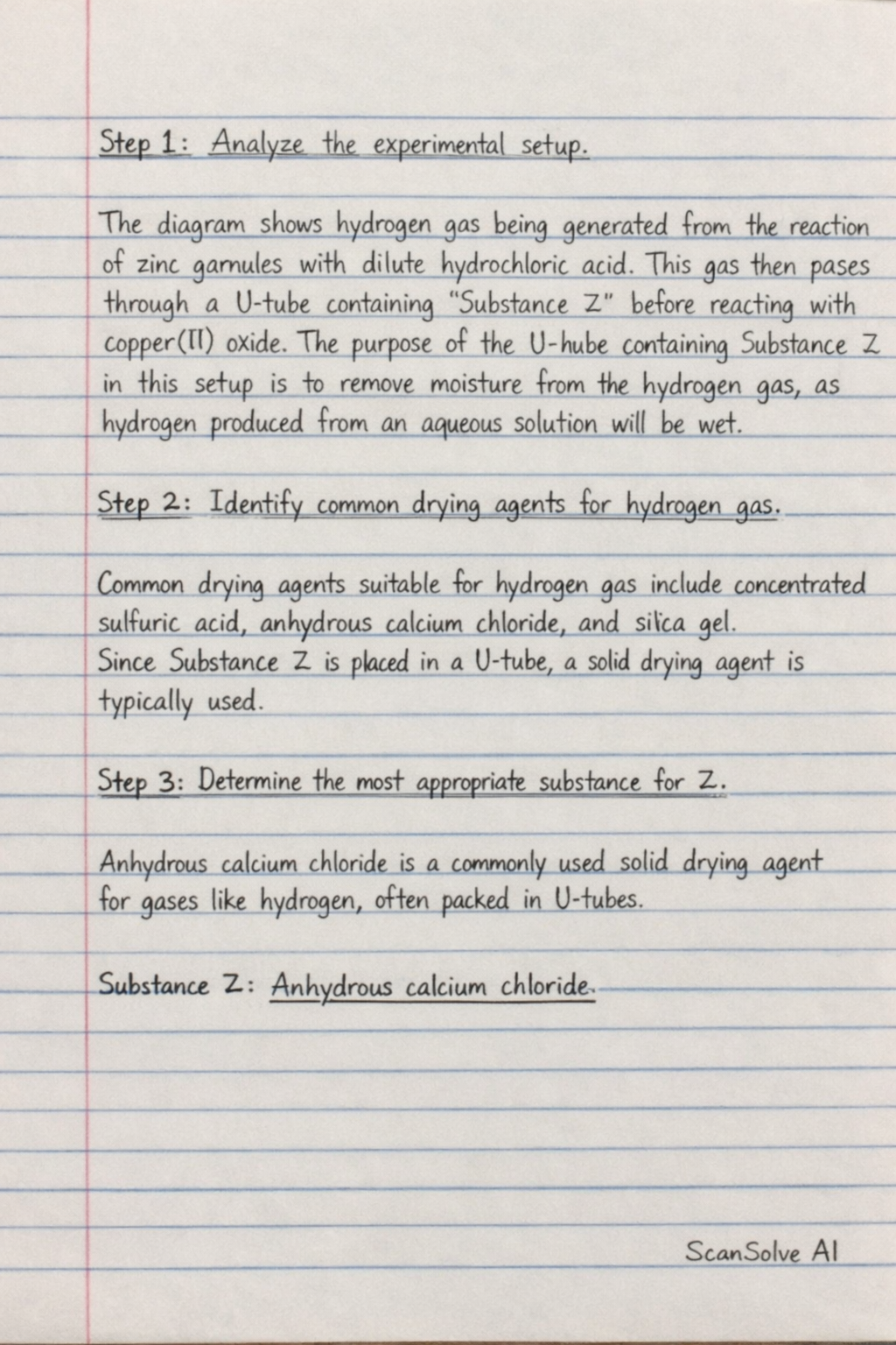 Common drying agents suitable for hydrogen gas include concentrated sulfuric acid, anhydrous calcium chloride, and silica gel. Since Substance Z is placed in a U-tube, a solid drying agent is typically used.